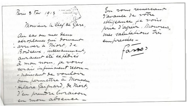 Pour la circonstance, GARROS a fait transporter ses deux aéroplanes de Bordeaux à Niort par voie ferrée (ci-dessous, sa lettre au chef de gare).
